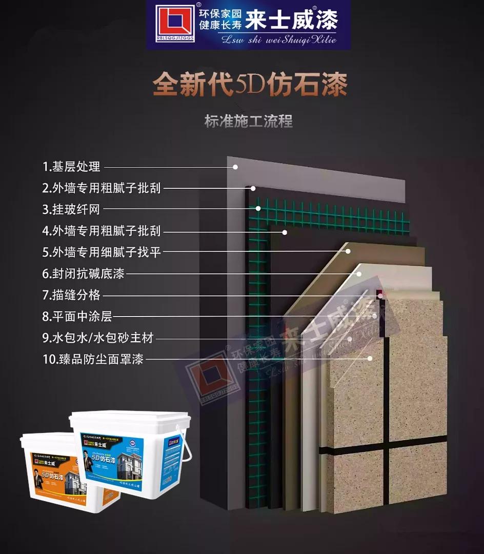 來士威5D仿石漆是新一代仿石漆,采用高分子技術,產(chǎn)品安全性高質(zhì)量輕、施工快捷簡易,為建筑體節(jié)能減重的同時,大大減縮了工程成本,是未來環(huán)保節(jié)能型建筑的綠色建材。