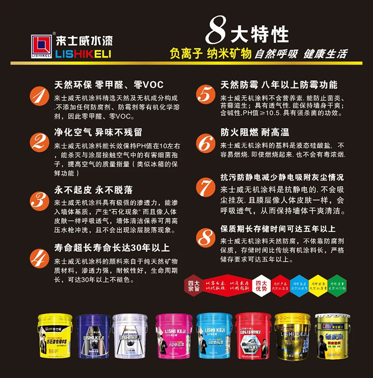 主要功能: 釋放負(fù)氧離子. 納米礦物抗菌抑菌. 調(diào)節(jié)濕度防霉自潔.治理甲醛凈化空氣. 消除靜電吸音降噪. 反射隔熱防火阻燃.